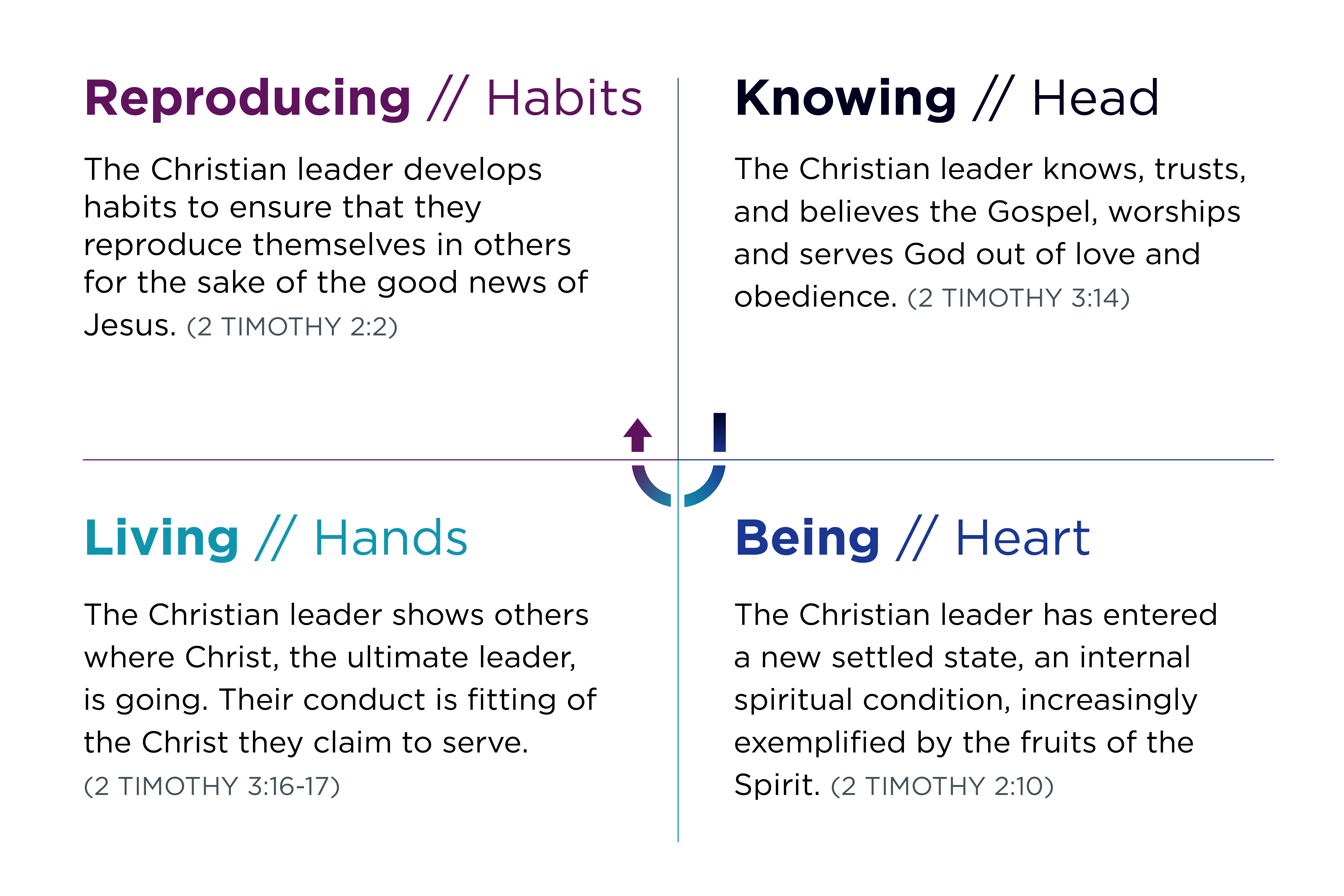 With the theme of discipleship running along the right-hand side and the theme of mission along the left, the leadership matrix flows from top right down the right-hand side. Starting with knowing, moving down to being, then living and ending with reproducing, the matrix can be summed up with head, heart, hands and habits.