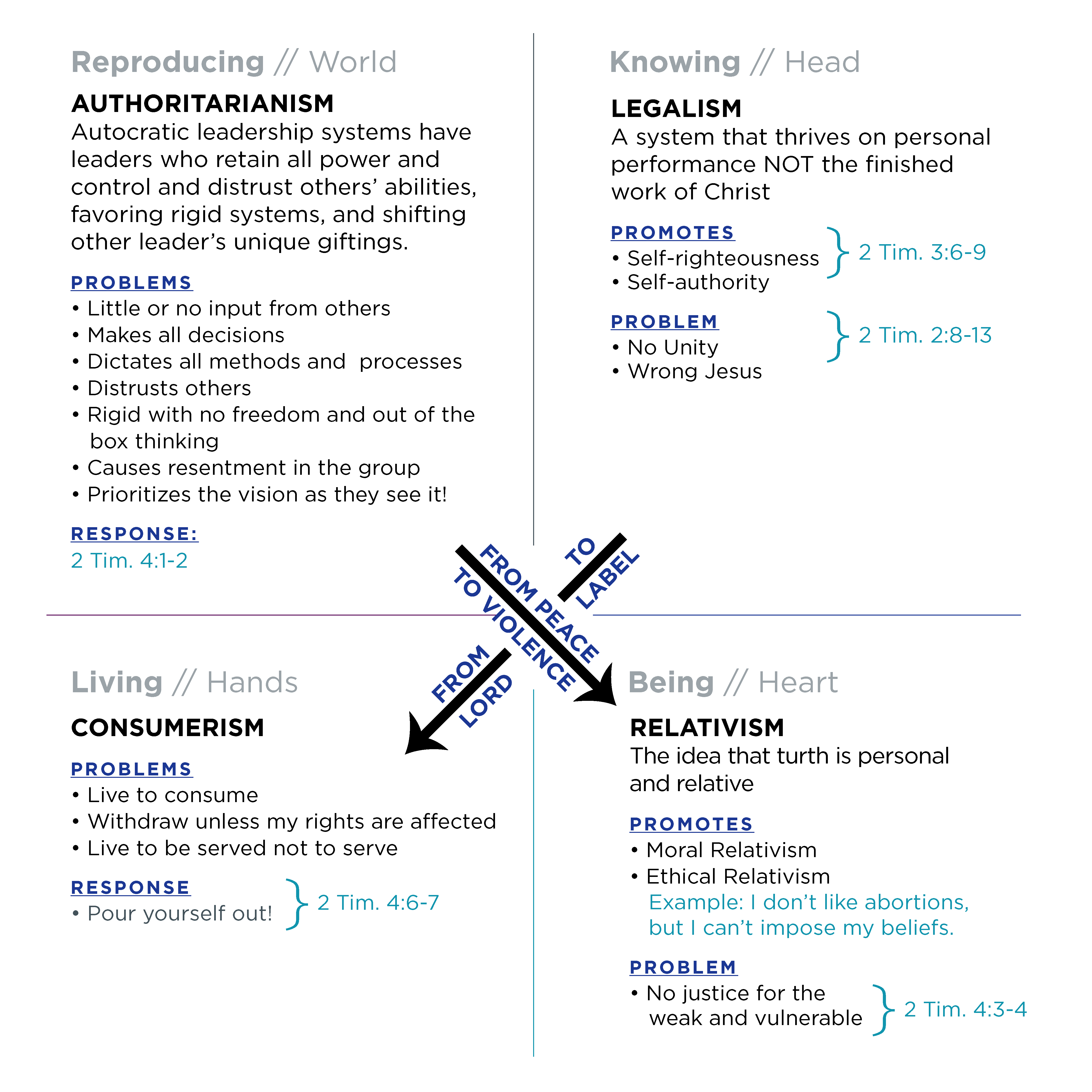 When virtues go wrong, when the mind and heart harden to the work of the Spirit, leaders fall foul to the temptations to legalism, relativism, consumerism, and authoritarianism. Today I’m turning to the fourth and final segment of our two-by-two matrix addressing the idea of reproduction.